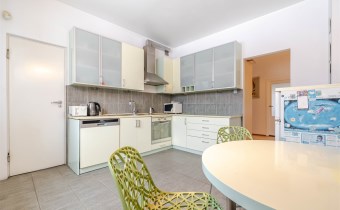 Оснащение кухни духовка, кухонные шкафы, плита, стол, холодильник с морозильной камерой, стоячие шкафы