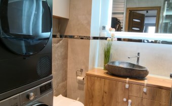 Оснащение ванной комнаты душ, зеркало, стиральная машина, туалет, умывальник
