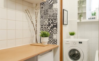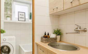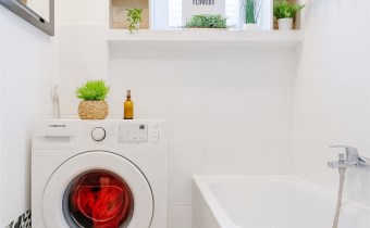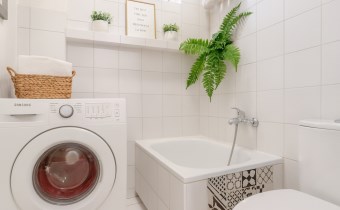 Оснащение ванной комнаты ванна, зеркало, стиральная машина, умывальник