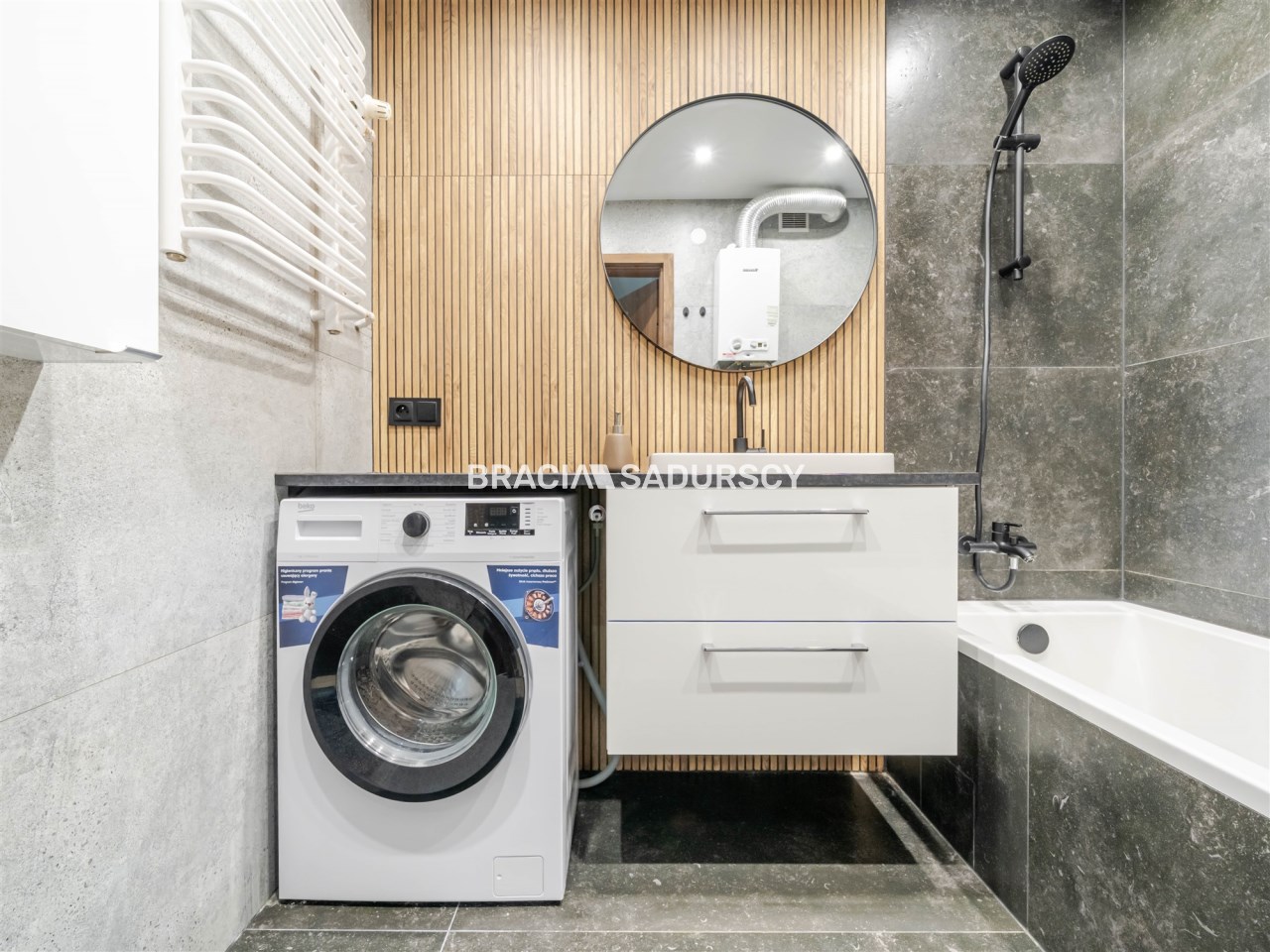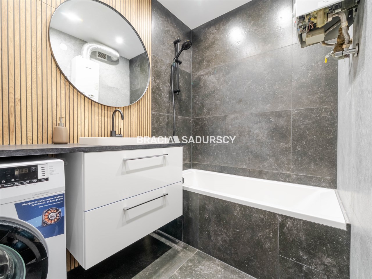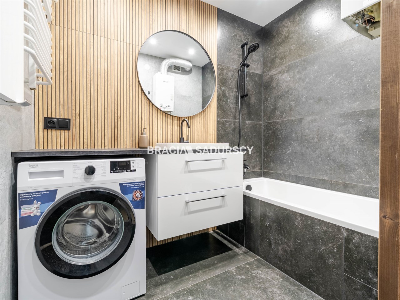 Оснащение ванной комнаты стиральная машина, зеркало, душ, умывальник, ванна