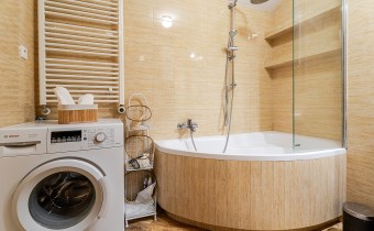Оснащение ванной комнаты умывальник, туалет, стиральная машина, зеркало, ванна