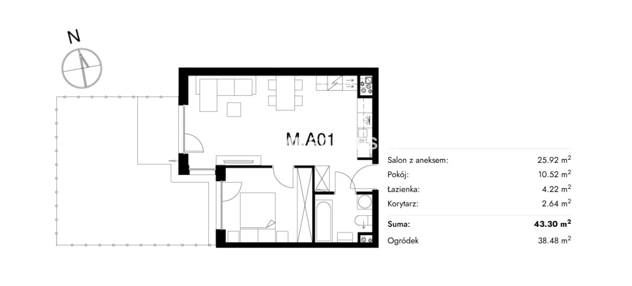 Площадь 43,30 m²