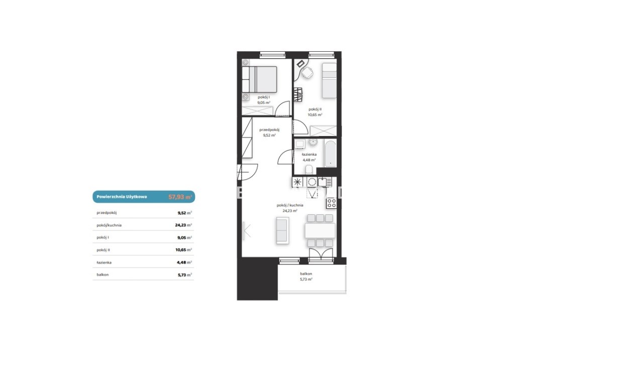 Площадь 57,93 m²