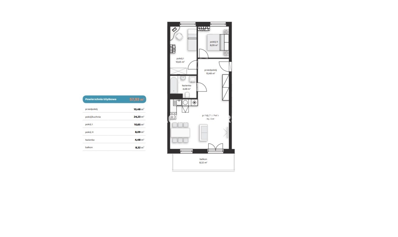 Площадь 57,93 m²
